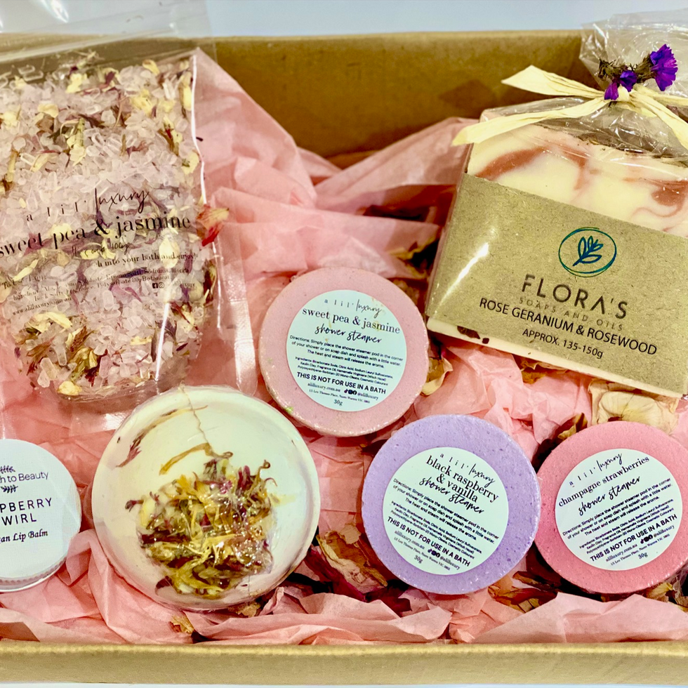 Experience a touch of bliss with our So Sweet Pamper Pack from Sunny’s Flower Farm. This all-natural, Australian-made set includes one soap, one bath soak, one bath bomb, one lip balm and three shower steamers. Perfect for self-care or as a thoughtful gift, this pamper pack exemplifies our commitment to quality and love for nature. Indulge yourself or surprise a loved one with the ultimate relaxation experience!